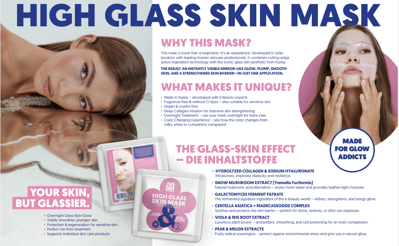 The glass-skin look is the ultimate K-beauty goal: flawless, hydrated, smooth and glowing. The High Glass Skin Mask combines advanced ingredient technology with a color-changing hydrogel formula that turns from milky to crystal clear during use. The result: a visible mirror-like glow, deep hydration and a stronger skin barrier.